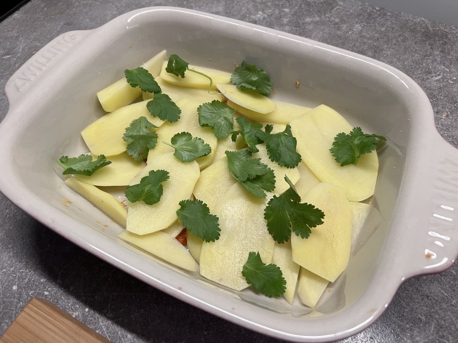 1. Bulves supjaustome plonais lapeliais. Kepimo indą pašlakstome alyvuogių aliejumi ir dedami bulves. Galima pjaustyti ir kitaip, bet šį kartą nusprendžiau kepti tokias.