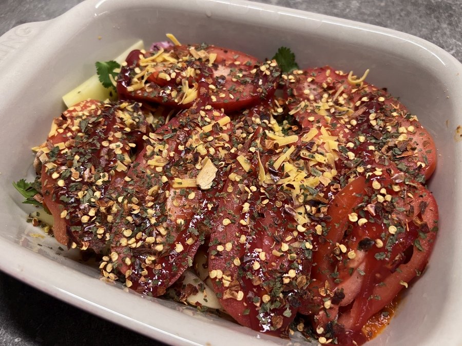 4. Paskutinis sluoksnis – griežinėliais supjaustytiems pomidorams. Padengiame viršutinį sluoksnį ir apšlakstome alyvuogių aliejumi.