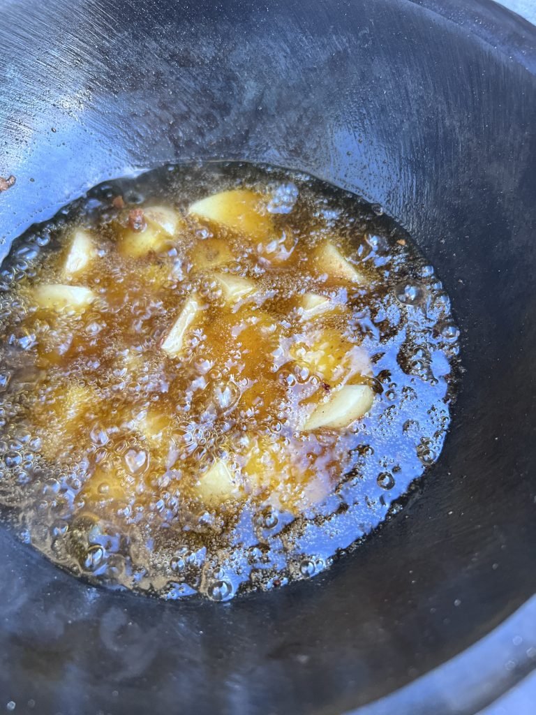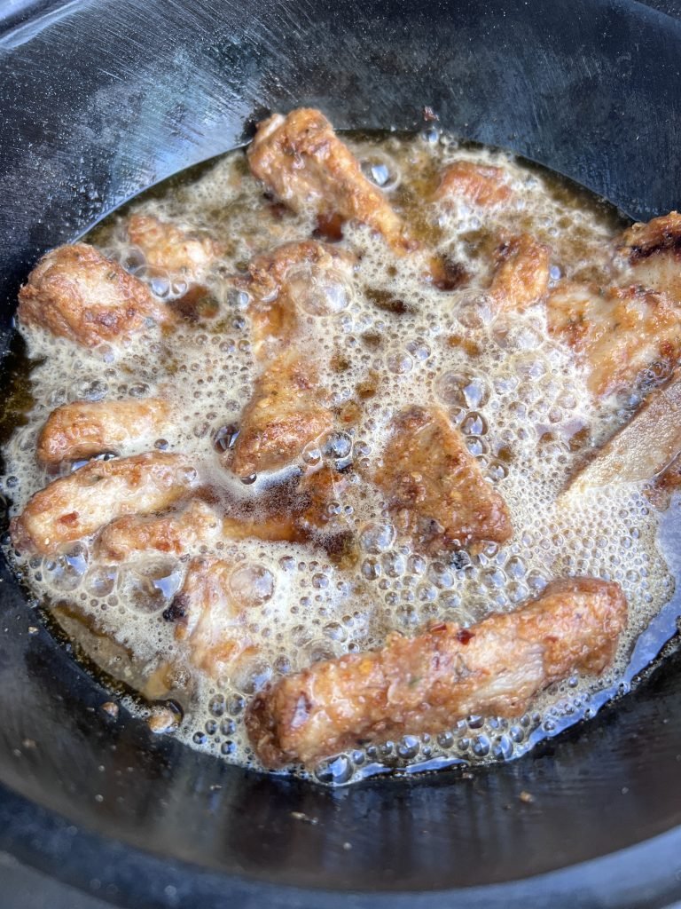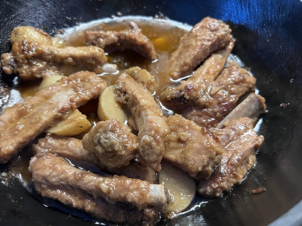 3. Įkaitiname kazaną, pilame aliejaus, sudedame šonkauliukus. Geriausia kepti etapais, kad kiekvienas būtų apsemtas ir neatvėsintų aliejaus. Kepame kol apskrunda, pageltonuoja, tada išimame.