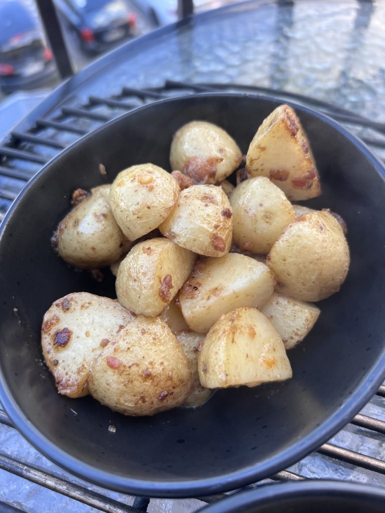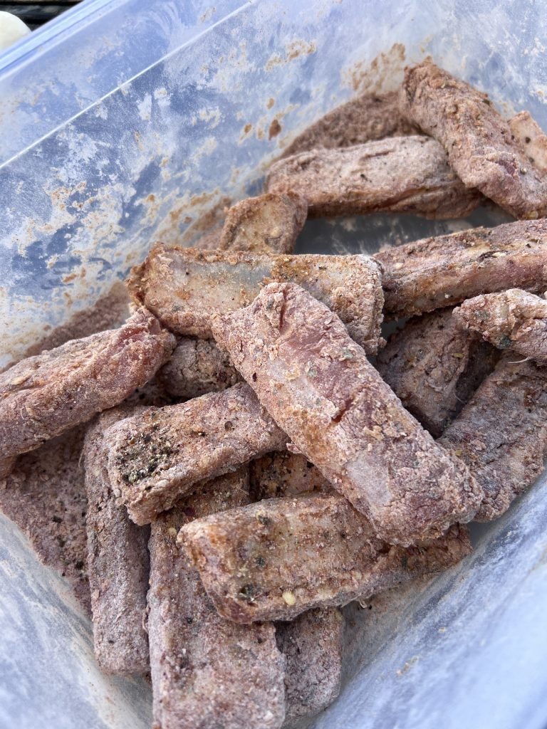 4. Aliejuje apkepame jau prieš tai supjaustytas mėgstamas bulvytes. Tol kol apskrus.