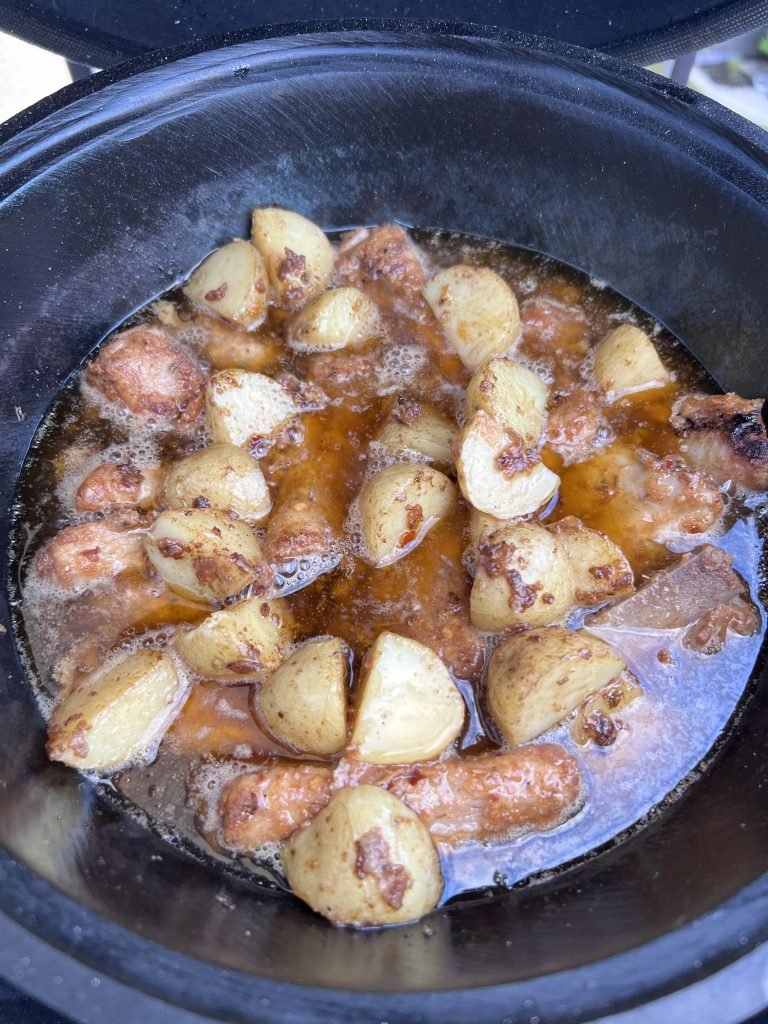 5. Išsemiame aliejų, paliekame vos vos ant dugno, dedame šonkauliukus, dedame bulvytes ir pilame tamsų alų. Man pakako vienos skardinės, šonkauliukai ir bulvytės paskendo alaus jūroje 🙂
