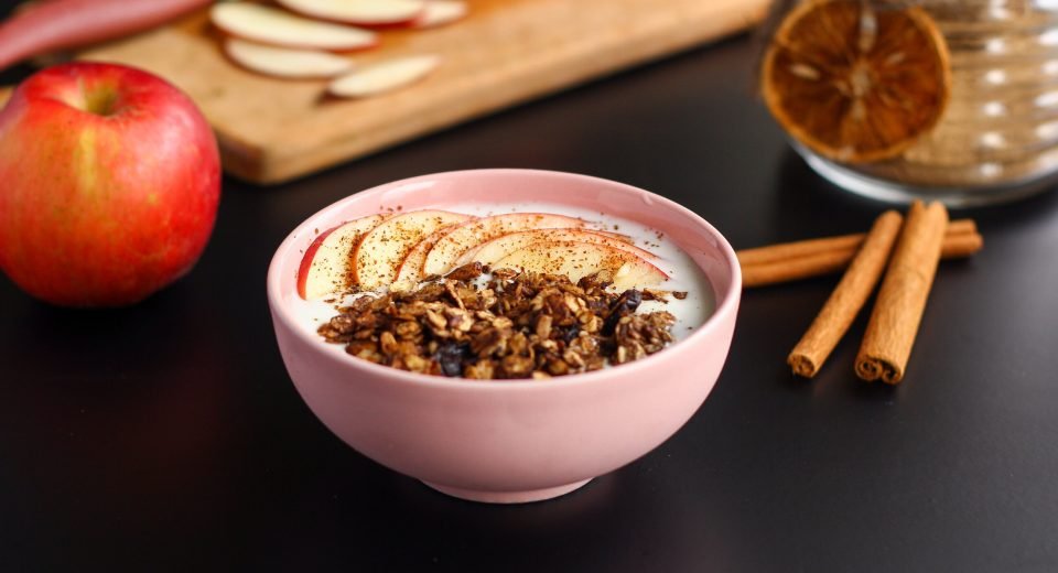 Jogurtas su vaisias Patiekalui reikės: Kaip gaminti:      Kriaušę ir obuolį supjaustykite kubeliais.     350–400 ml stiklainį arba dubenėlį užpildykite granolos, kriaušių, obuolių ir jogurto sluoksniais. Skanaus! Už receptą dėkojame prakybos tinklui „Rimi“.